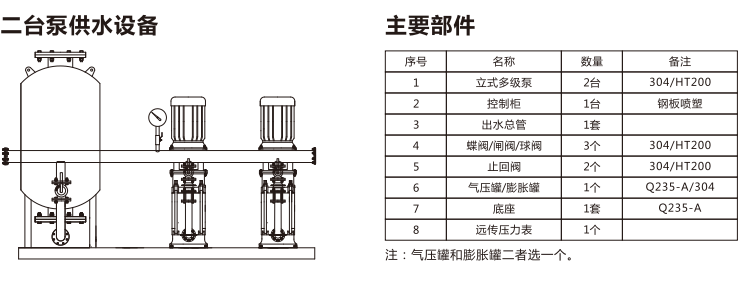 設(shè)備型號(hào) 給水設(shè)備 主泵 增壓穩(wěn)壓設(shè)備 適用場(chǎng)所 設(shè)備流量m?/h 設(shè)備揚(yáng)程m 型號(hào) 揚(yáng)程m 數(shù)量 型 號(hào) 揚(yáng)程m 數(shù)量 氣壓罐mm 供水戶數(shù) 供水高度m 12.5-24-50DL-2 12.5 24 DL50×2 24 2 LG25×3 30 2 600 50 12 12.5-36-50DL-2 12.5 36 DL50×3 36 2 LG25×3 30 2 600 50 20 12.5-60-50DL-2 12.5 60 DL50×5 60 2 LG25×3 30 2 600 50 38 12.5-80-50DL-2 12.5 80 DL50×6 80 2 LG25×3 30 2 600 50 55 25-24-50DL-3 25 24 DL50×2 24 3 LG25×3 30 2 600 100 12 25-36-50DL-3 25 36 DL50×3 36 3 LG25×3 30 2 600 100 20 25-60-50DL-3 25 60 DL50×5 60 3 LG25×3 30 2 600 100 38 25-80-50DL-3 25 80 DL50×6 80 3 LG25×3 30 2 600 100 55 50-40-80DL-2 50 40 DL80×2 40 2 LG32×3 45 2 800 200 25 50-60-80DL-2 50 60 DL80×3 60 2 LG32×3 45 2 800 200 38 50-80-80DL-2 50 80 DL80×4 80 2 LG32×3 45 2 800 200 55 50-100-80DL-2 50 100 DL80×5 100 2 LG32×3 45 2 800 200 72 100-40-80DL-3 100 40 DL80×2 40 3 LG40×3 45 2 1000 600 25 100-60-80DL-3 100 60 DL80×3 60 3 LG40×3 45 2 1000 600 38 100-80-80DL-3 100 80 DL80×4 80 3 LG40×3 45 2 1000 600 55 100-100-80DL-3 100 100 DL80×5 100 3 LG40×3 45 2 1000 600 72 150-40-80DL-4 150 40 DL80×2 40 4 LG50×3 40 2 1200 1000 25 150-60-80DL-4 150 60 DL80×3 60 4 LG50×3 40 2 1200 1000 38 150-80-80DL-4 150 80 DL80×4 80 4 LG50×3 40 2 1200 1000 55 150-100-80DL-4 150 100 DL80×5 100 4 LG50×3 40 2 1200 1000 72 200-40-100DL-3 200 40 DL100×2 40 4 LG50×3 40 2 1200 1500 25 200-60-100DL-3 200 60 DL100×3 60 4 LG50×3 40 2 1200 1500 38 200-80-100DL-3 200 80 DL100×4 80 4 LG50×3 40 2 1200 1500 55 200-100-100DL-3 200 100 DL100×5 100 4 LG50×3 40 2 1200 1500 72 300-40-150DL-3 300 40 DL150×2 40 4 LG50×3 40 2 1400 2000 25 300-60-150DL-3 300 60 DL150×3 60 4 LG50×3 40 2 1400 2000 38 300-80-150DL-3 300 80 DL150×4 80 4 LG50×3 40 2 1400 2000 55 300-100-150DL-3 300 100 DL150×5 100 4 LG50×3 40 2 1400 2000 72